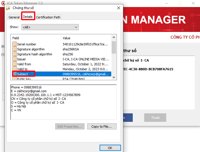 Tại mục “Details chọn Subject” kiểm tra thông tin chữ ký số: